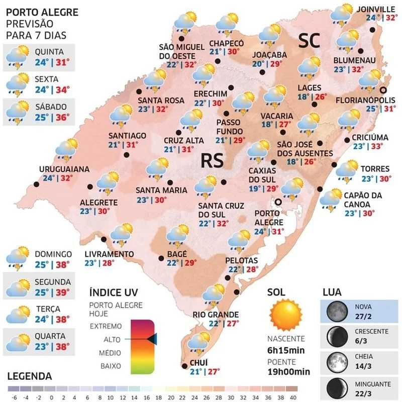 O dia, porém, será muito abafado pela umidade. Uma maior quantidade de nuvens cobre o território gaúcho. Com o ar quente e úmido, volta a chover em todas as regiões, de forma irregular e mal distribuída.