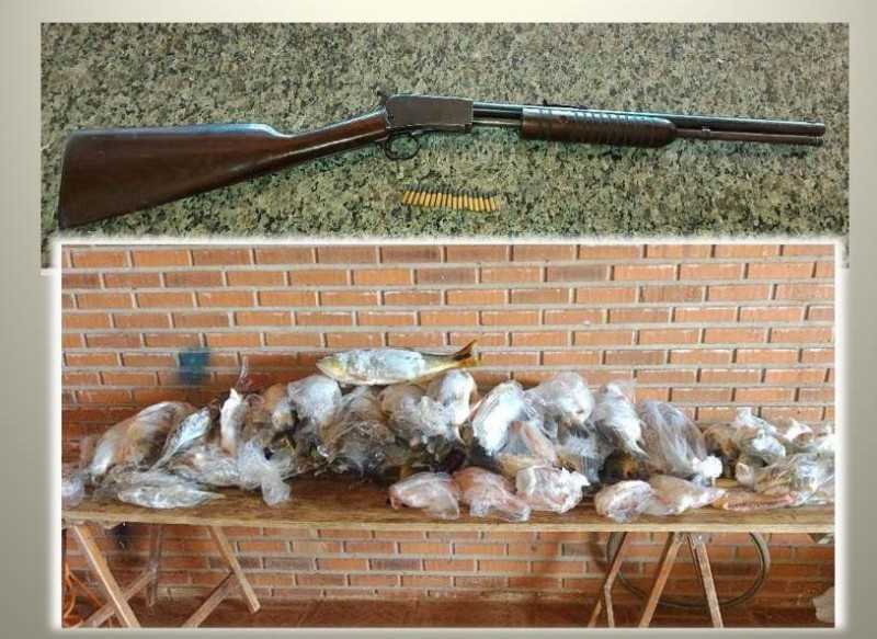 Todo o pescado estava em um galpão. Durante as buscas foi questionado o acusado se possuía arma de fogo, sendo que o mesmo confirmou e apresentou um rifle Rossi calibre 22, juntamente com 17 munições do mesmo calibre, marca CBC.