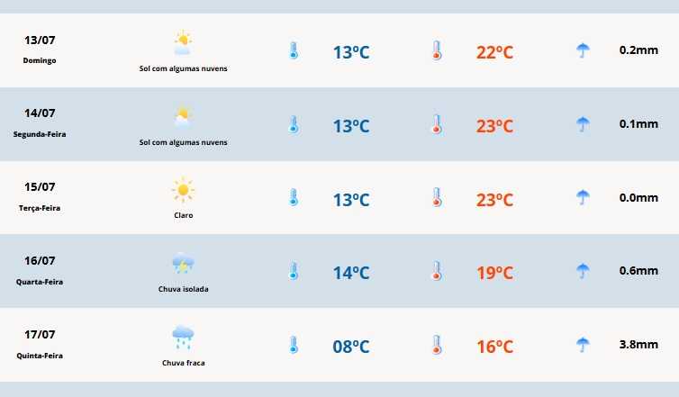 Em Cerro Largo, a temperatura ficará entre 13ºC e 22ºC.