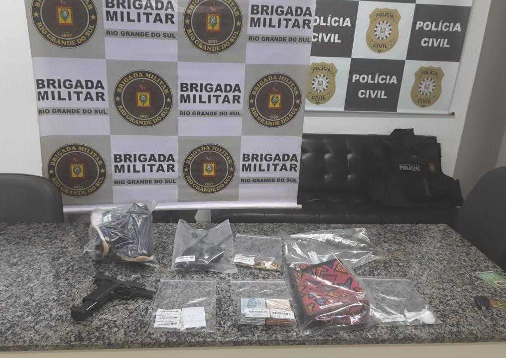 Foi apreendida uma pistola de calibre 380mm e um revólver de calibre .38mm, ambos municiados, e R$ 1.350,00 em dinheiro. Diante disto, um indivíduo de 25 anos, natural de Giruá, e o outro de 34 anos, natural de Santo Ângelo, ambos com antecedentes, foram autuados em flagrante pelo crime de roubo majorado consumado e porte ilegal de arma de fogo de calibre de uso permitido, e após as formalidades legais foram conduzidos ao Presídio Regional de Santo Ângelo.