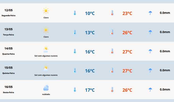 Já a tarde vai ser de temperatura agradável e típica de maio, assim como durante o final de semana. A temperatura máxima deve ultrapassar os 20°C na maioria dos municípios gaúchos.