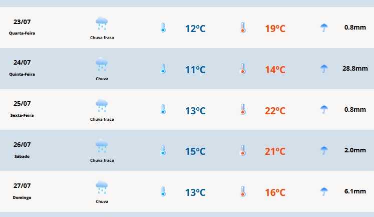 Em Cerro Largo a temperatura mínima será de 12°C e a máxima de 19°C.