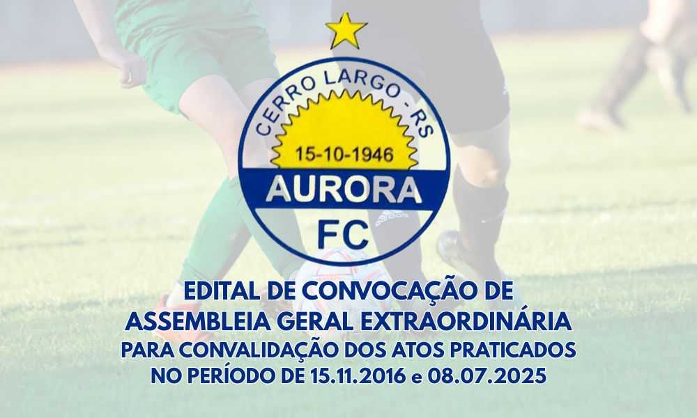 A Comissão de Associados que administra a Associação Aurora Futebol Clube representada pelo seu Presidente abaixo subscrito e, em conformidade com o Código Civil vigente e, de acordo com os Estatutos Sociais capitulo VI , artigo 28 inciso IV, e parágrafo único do referido artigo, convoca os Associados com registro vigentes até 30 de junho de 2025 para uma Assembleia Geral Extraordinária à ser realizada no Hotel Missões de Cerro Largo-RS no próximo dia 15 de agosto de 2025 em 1ª convocação às 18:00 horas com a maioria absoluta dos associados e às 18:30 horas em segunda convocação com a presença mínima de 06 (seis) Associados com a seguinte Ordem do Dia: