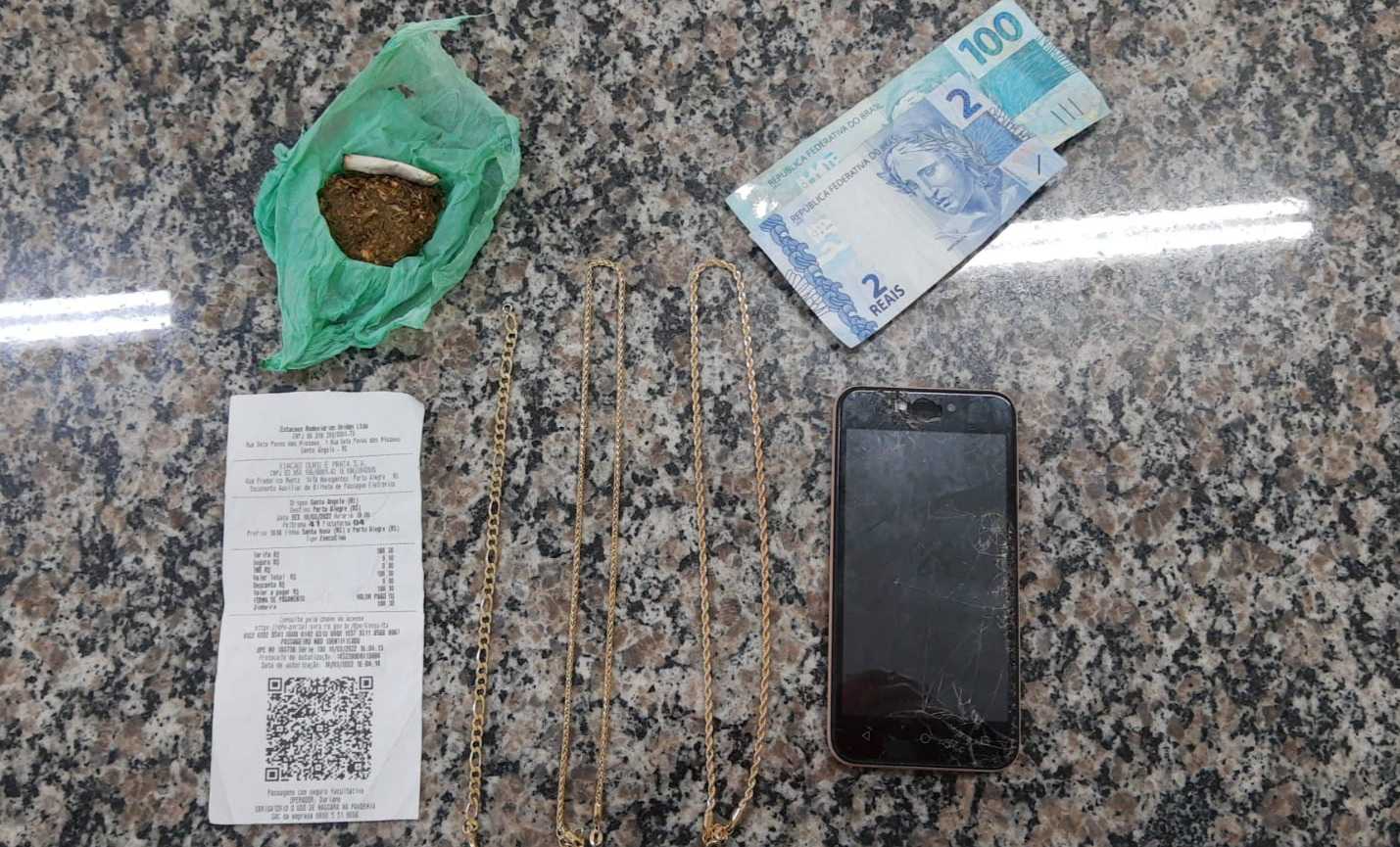 O indivíduo foi identificado e com ele havia uma bucha de maconha e três correntes de ouro, as quais foram reconhecidas pelo proprietário da relojoaria como parte das jóias roubadas no assalto. Diante disso, foi feita a prisão em flagrante do abordado pelo crime de roubo.