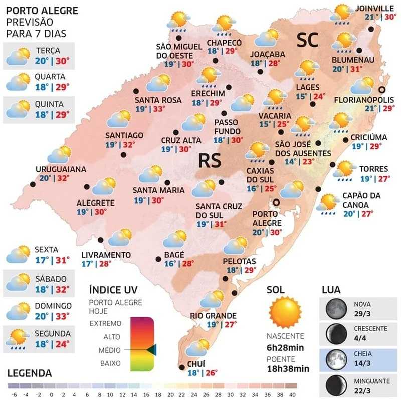 Na maioria das cidades gaúchas não há chance de chuva, sendo o dia de tempo firme. O amanhecer tem mínimas mais altas que nos últimos dias e agradáveis. Já a tarde será pouco quente na maior parte das cidades com aquecimento maior no Oeste e no Noroeste.