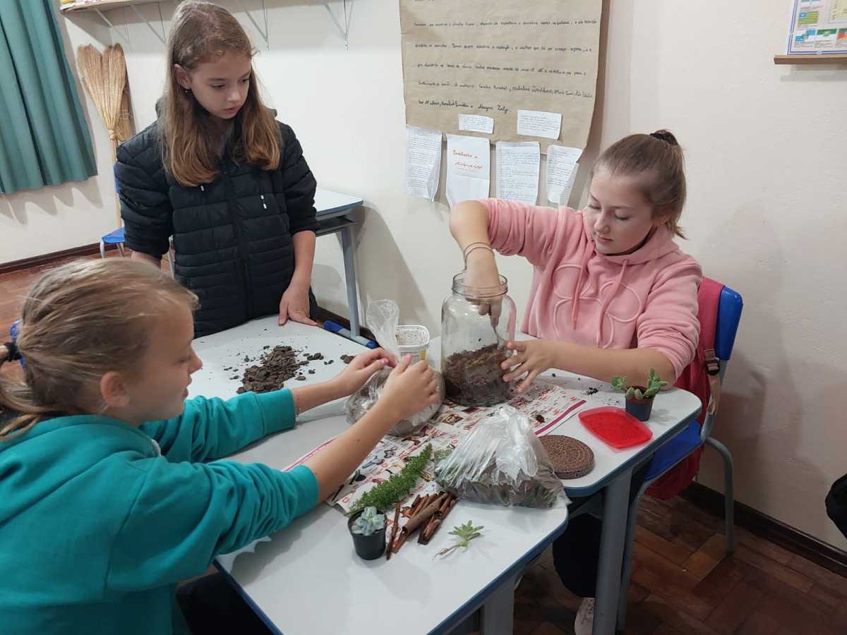 Os alunos do 6° ano da Escola Municipal de Ensino Fundamental São Francisco de Borja, na disciplina de Ciências, realizaram a atividade prática de confecção de um terrário.