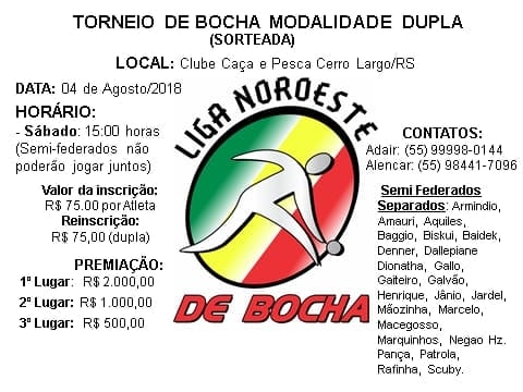 Neste sábado, dia 4 de agosto, está previsto um Torneio de Bocha - Modalidade Dupla (sorteada), no Clube Caça e Pesca de Cerro Largo.
