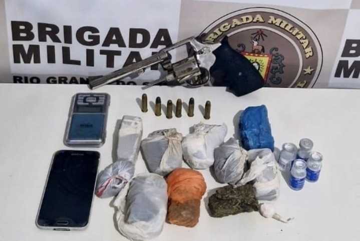 Os indivíduos foram localizados, abordados, identificados e revistados pelas guarnições, tendo sido encontrada na mochila de um deles uma grande porção de entorpecentes como maconha, crack e cocaína, uma balança de precisão, um revólver e munições no tambor, intactas.