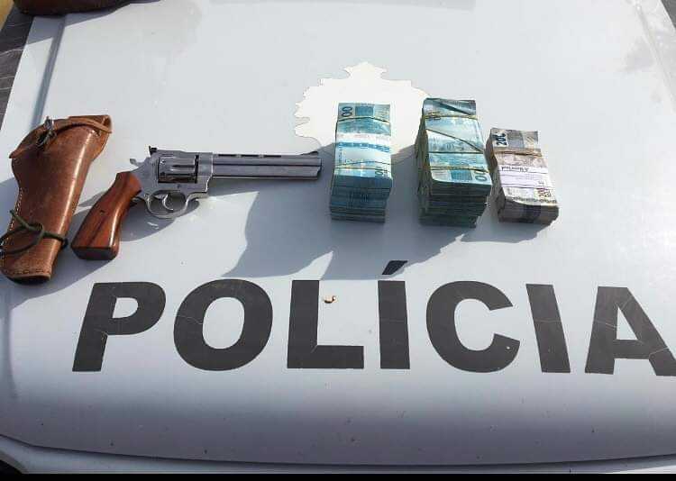 En revista veicular foi localizado dentro de uma madeira a quantia de R$ 140.600,00 e dentro de um compartimento no banco do caroneiro foi localizado um revólver marcar Taurus, calibre 357, municiado com 8 cartuchos intactos calibre 357. O revólver possuía registro e o condutor possui CAC (caçador, atirador, colecionador). Diante disso, foi confeccionado o registro policial pela BM e os materiais foram apreendidos.