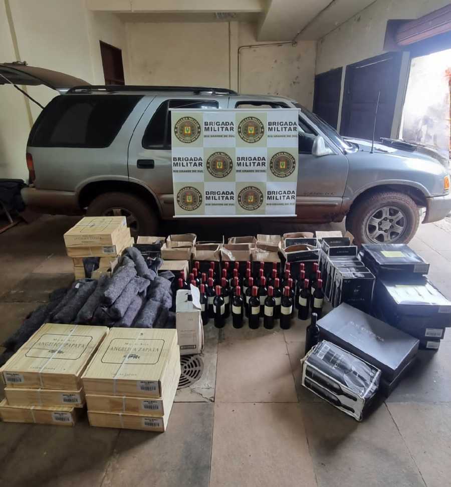Foi efetuada abordagem e em revista ao veiculo foram localizadas aproximadamente 320 garrafas de vinhos e espumantes estrangeiros de diversas marcas, totalizando valor estimado de comércio de R$ 88.494,00.