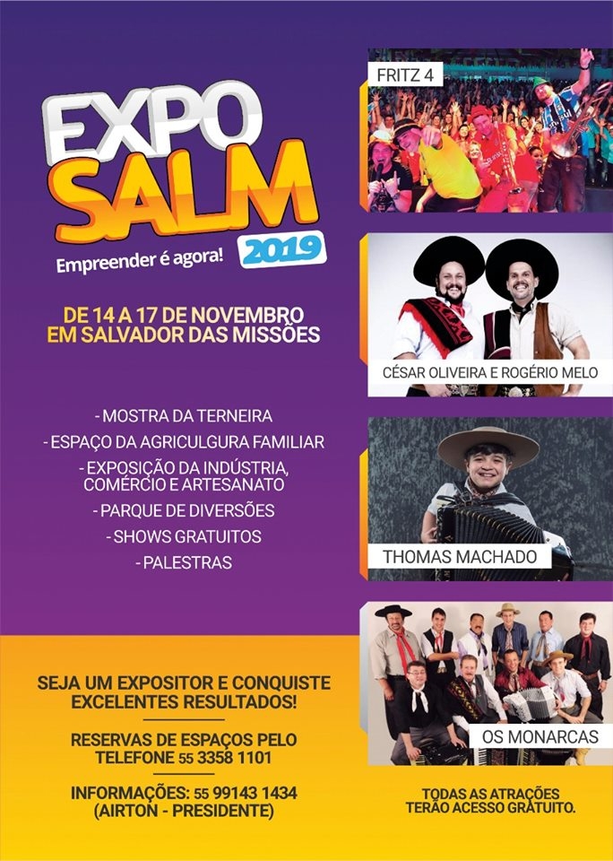 A 10ª Expolsam acontece de 14 a 17 de novembro de 2019, em Salvador das Missões.