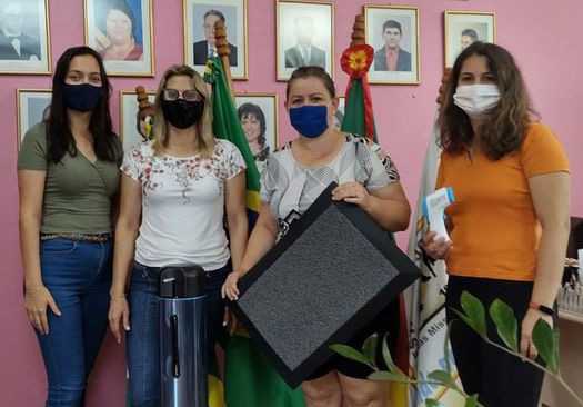 A secretária municipal de Educação Cheila Spies e a supervisora Patrícia Bamberg estiveram no Colégio Estadual João de Castilho ontem, dia 27, para entregar materiais que serão usados na prevenção ao novo coronavírus, pelos alunos, professores e funcionários daquele educandário.