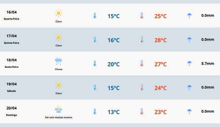 Em Cerro Largo a temperatura terá mínima de 15ºC e máxima de 25ºC.