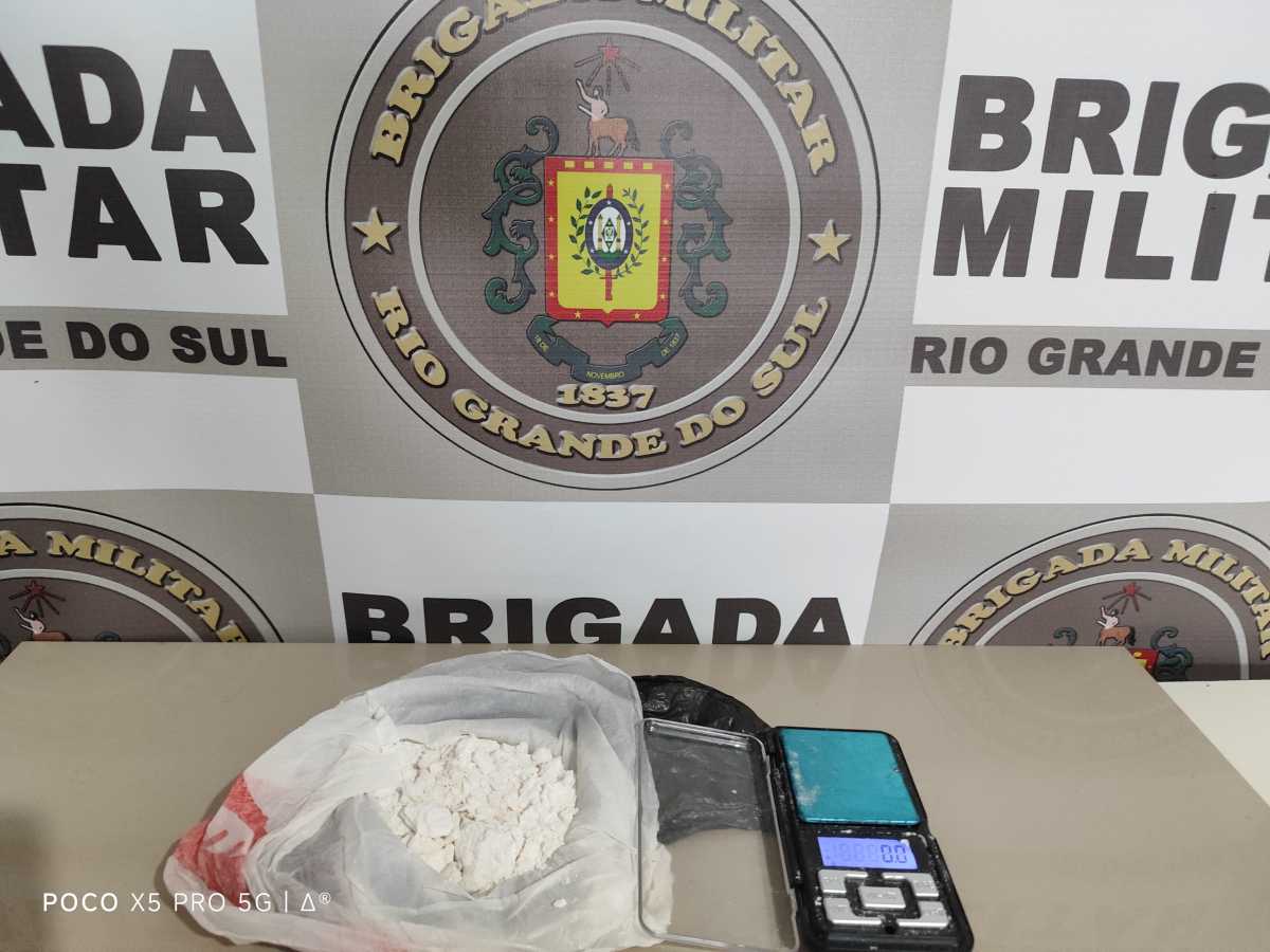 Na chegada da guarnição, os dois indivíduos conversavam, e ao ser dado comando de abordagem foi encontrado com um deles um invólucro contendo cocaína, pesando 79,5 gramas e uma balança de precisão.
