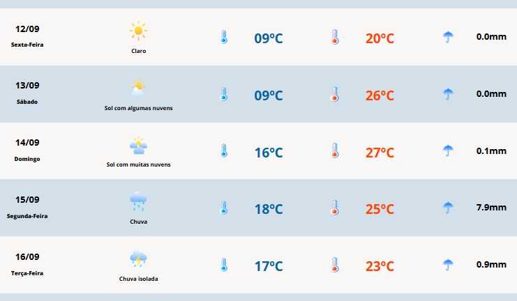 O estado continua sob a influência de um centro de alta pressão, o que mantém o tempo estável e sem previsão de chuvas significativas para os próximos dias.