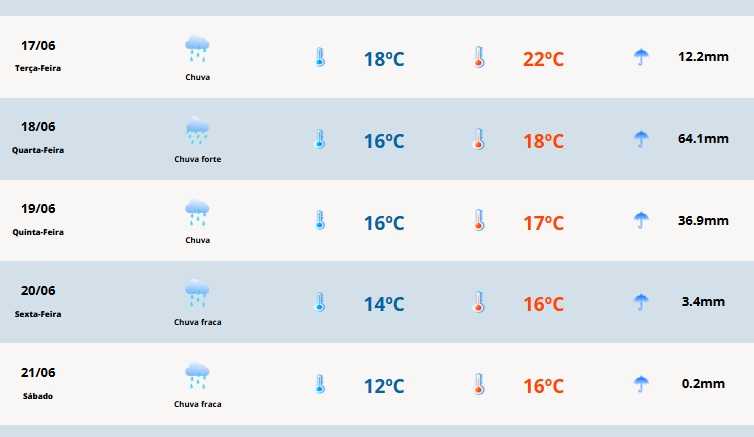 A chuva segue até sexta-feira no estado, com previsão de altos acumulados. Os volumes podem ficar entre 100% a 200% da média histórica de precipitação de junho em grande número de municípios.