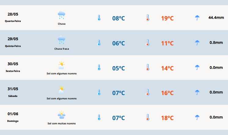 Além da chuva, uma grande massa de ar frio toma conta do estado no decorrer do dia com queda acentuada da temperatura. As máximas ocorrem na madrugada desta quarta e as mínima no final do dia.