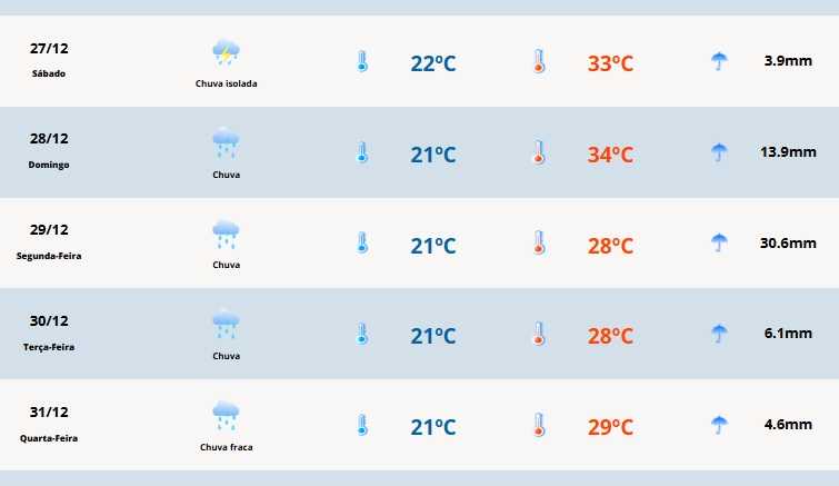 Em Cerro Largo a temperatura varia entre 22ºC e 33ºC; no litoral norte, em Capão da Canoa e em Torres, a mínima será a mesma da capital gaúcha - 23°C, mas nas cidades litorâneas a máxima será de 31ºC. Em Bagé, as marcas oscilam entre 22ºC e 27ºC, enquanto em Erechim fica entre 21ºC e 30ºC e em Uruguaiana de 23ºC a 28ºC.