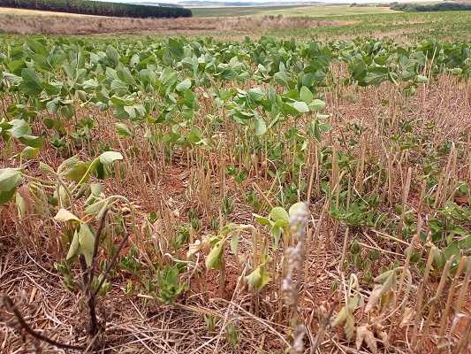 Em relação às condições das lavouras, as mais antigas, que receberam precipitações, retomaram o crescimento a partir da emissão de novos trifólios, com folhas bem desenvolvidas e coloração verde intensa. Onde não choveu, ou o volume foi muito baixo, permanecem os sintomas de déficit hídrico, como o murchamento de folhas, a paralização no crescimento, a senescência de algumas folhas baixeiras e, em casos extremos, a morte de plantas.
