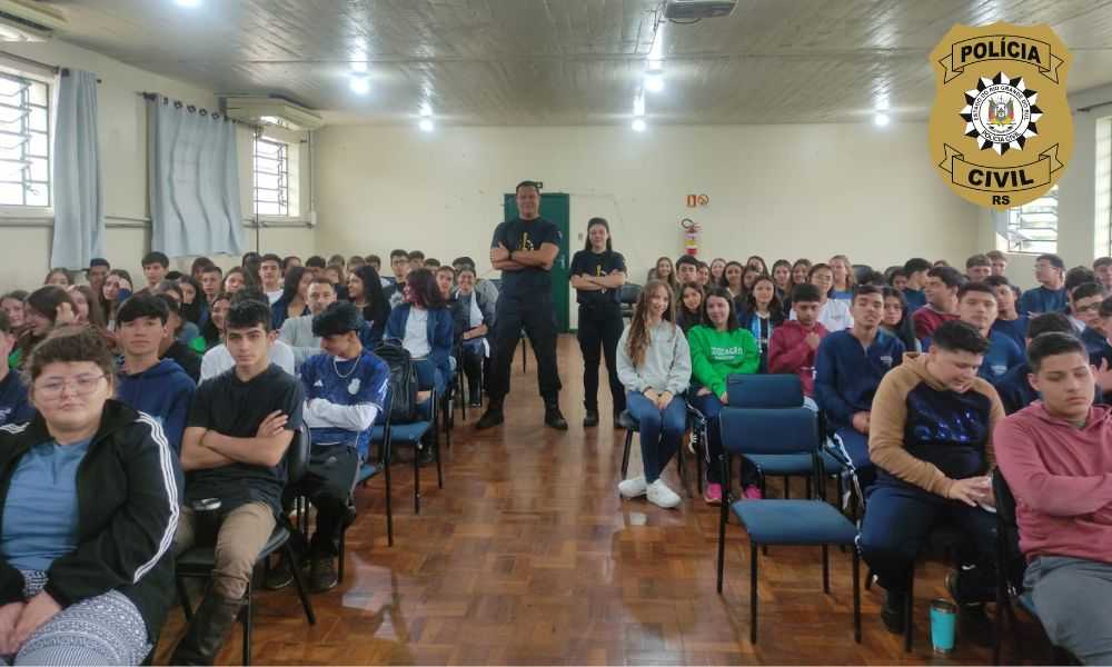 Na manhã de terça-feira (01/04), os policiais civis, delegado Gerson de Assis e escrivã Vanessa Polga, realizaram uma atividade do Papo de Responsa na Escola Técnica Estadual Cruzeiro do Sul, em São Luiz Gonzaga. O papo inaugurou os eventos da Semana de Combate ao Bullying.