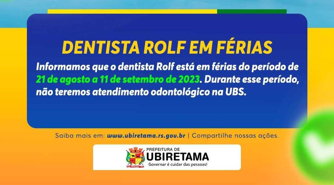 Informamos que o dentista Rolf, que atende na UBS de Ubiretama, está em férias do período de 21 de agosto a 11 de setembro de 2023.