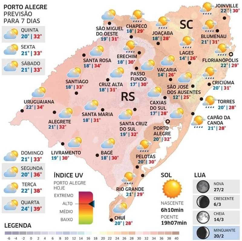 Esta quinta-feira (20/02) será mais um dia de sol e nuvens na maior parte do Rio Grande do Sul. Contudo, tempo não vai estar firme em todo o estado. Há chance de precipitação, especialmente no fim da tarde, em alguns pontos. É o caso da faixa litorânea, da área da Lagoa dos Patos e seu entorno, o Médio e o Alto Uruguai.