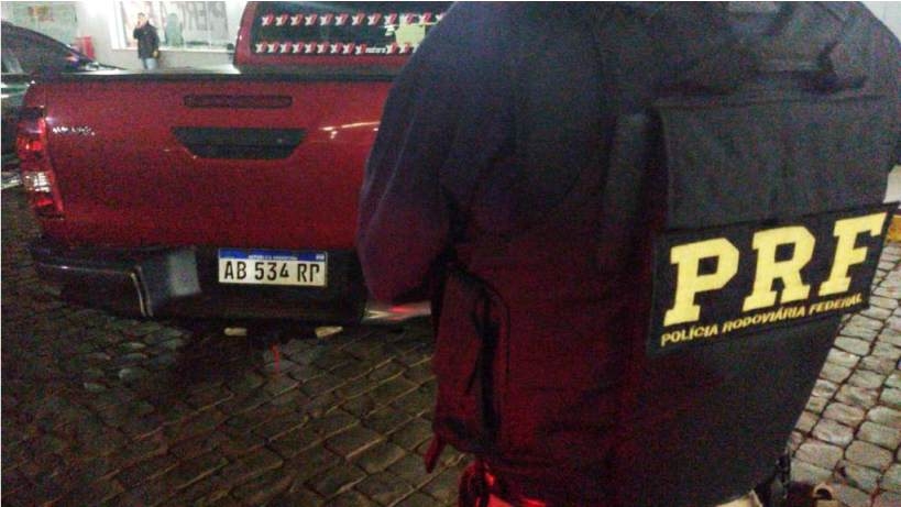 Em fiscalização na Unidade Operacional da Polícia Rodoviária Federal (PRF), em São Borja, por volta das 21h de ontem (27), um veículo Toyota Hilux, com placas argentinas, cruzou em alta velocidade, no sentido interior, o que gerou suspeita da equipe, sendo que o veículo foi acompanhado e abordado no pátio de um posto de combustíveis, na BR 285.