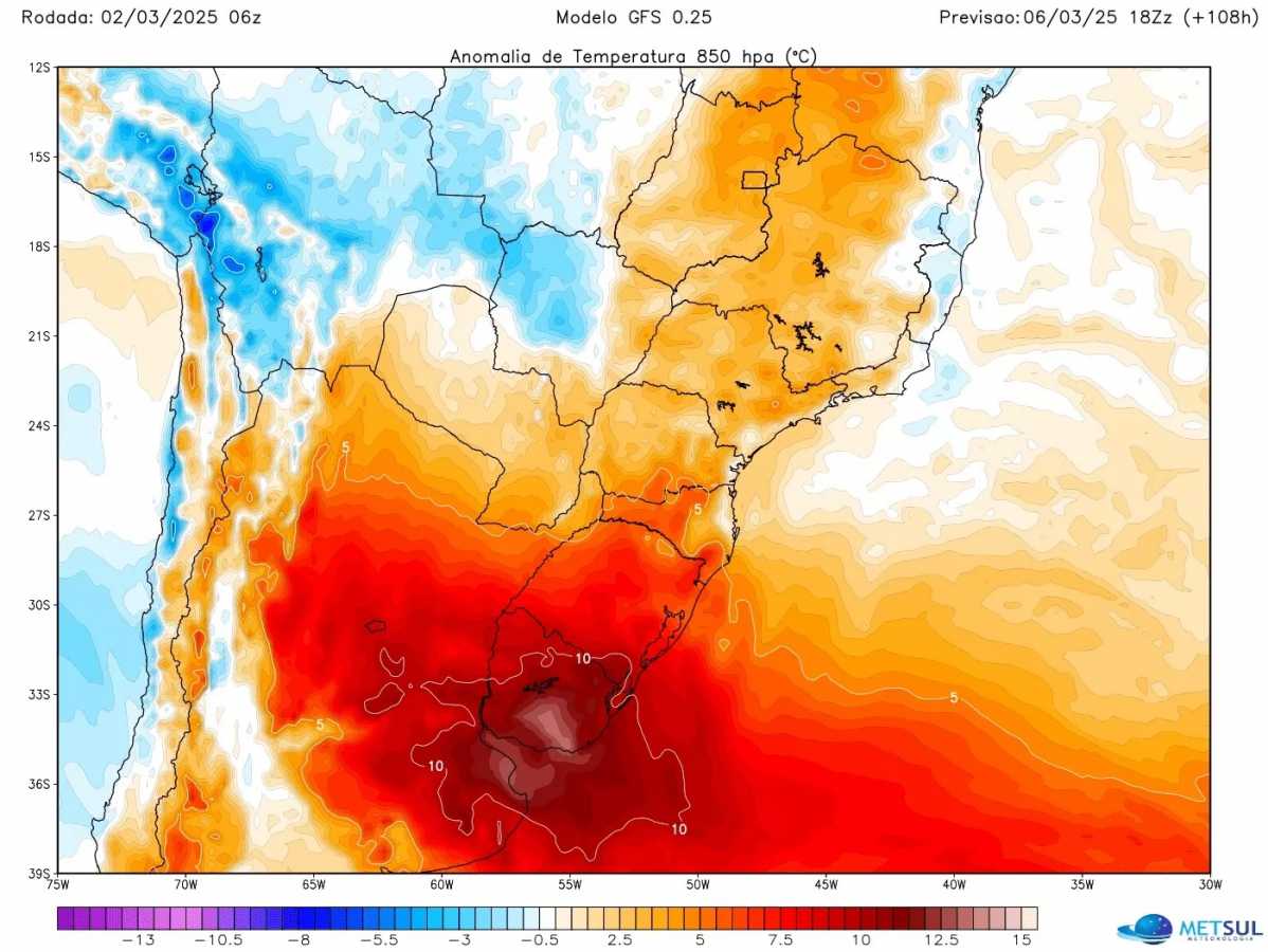 Uma bolha de calor vai estar nesta semana nas latitudes médias da América do Sul com os maiores desvios de temperatura em relação à média histórica entre a Argentina, o Uruguai e o Rio Grande do Sul.