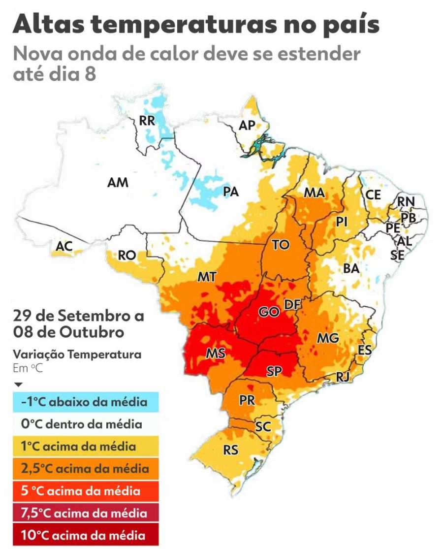 País deve ter nova sequência de dias com marcas acima da média, baixa qualidade do ar e potencial para novos focos de incêndio. Fenômeno deve se estender até segunda semana de outubro