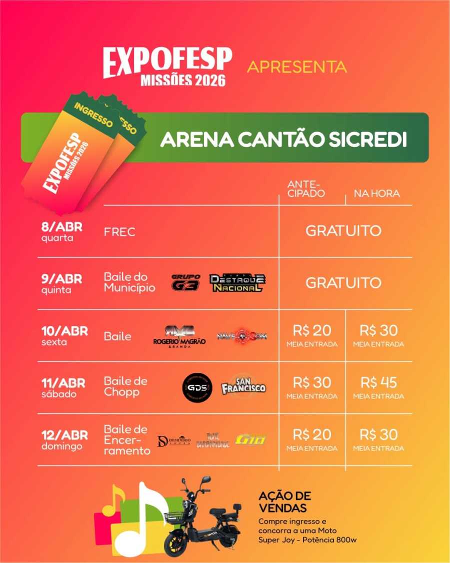 Marcando os 30 dias para a 4ª Expofesp Missões, em Sâo Paulo das Missões, a Comissão Organizadora da feira lançou as principais atrações que acontecerão na Arena de Shows e a ação de vendas na comercialização dos ingressos individuais e permanentes, tendo como prêmio uma Moto Elétrica Super Joy.