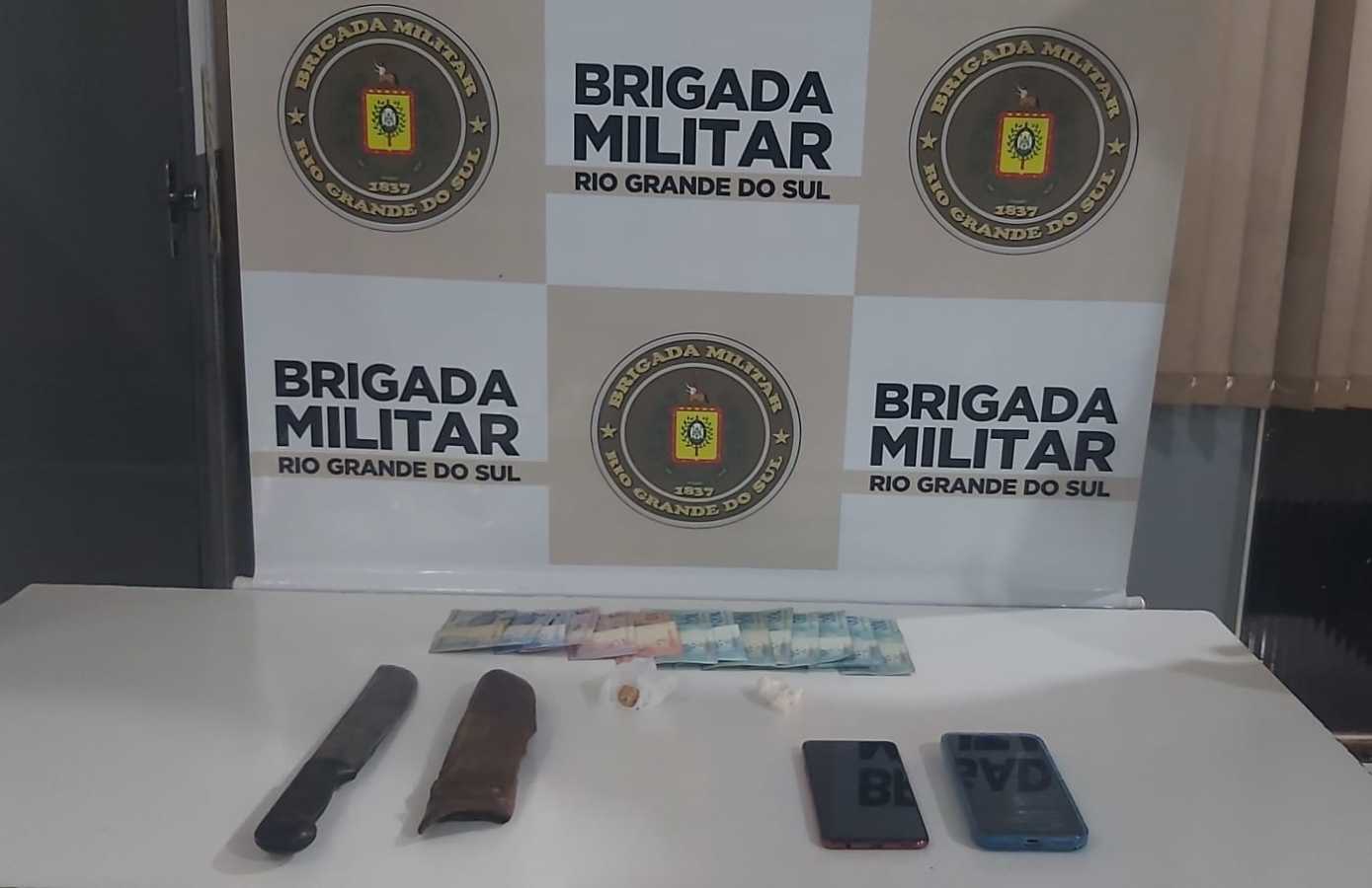 Em revista pessoal no homem, foram localizados uma pedra de crack, uma porção de cocaína, R$ 826,00 em espécie, um telefone celular marca LG e um facão.
