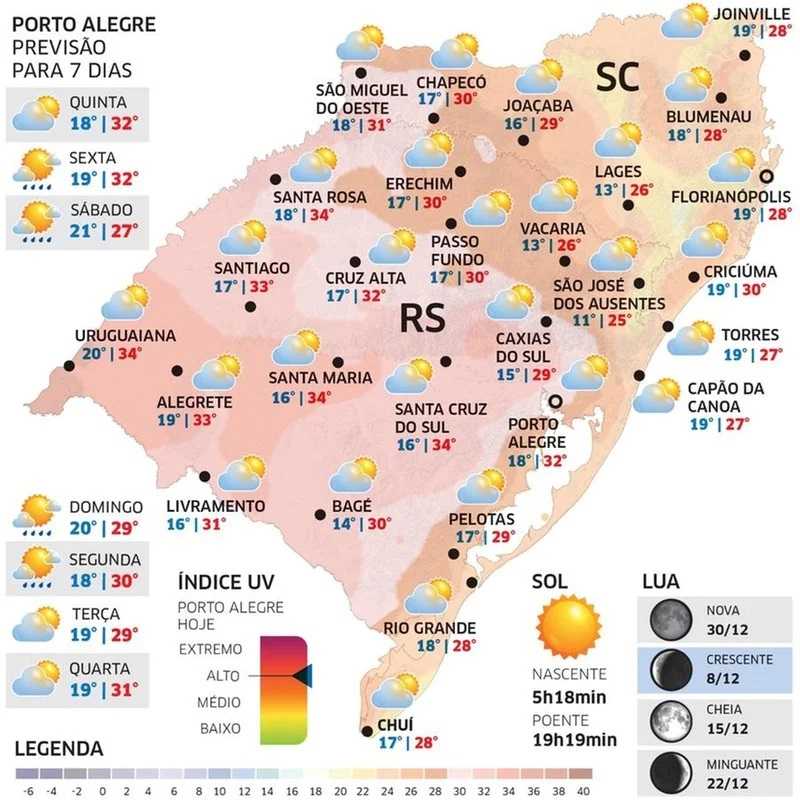 Com o tempo aberto e ingresso de ar mais quente, a temperatura segue em elevação. O começo da manhã é agradável, porém aquece rapidamente com o sol. A tarde será de calor em quase todo o Estado, com maior intensidade nas cidades do Centro para o Oeste gaúcho. Alguns municípios podem ter máximas entre 33ºC e 34ºC.