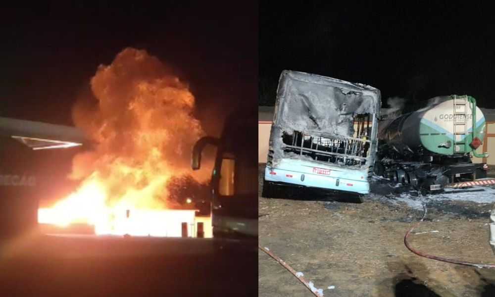 As chamas destruíram completamente um ônibus e também atingiram um caminhão-tanque, provocando danos significativos.