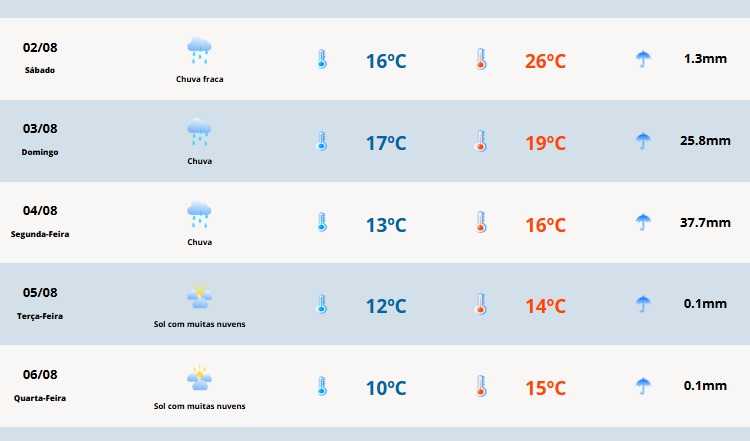 Em Cerro Largo a temperatura mínima será de 16°C e a máxima de 26°C.