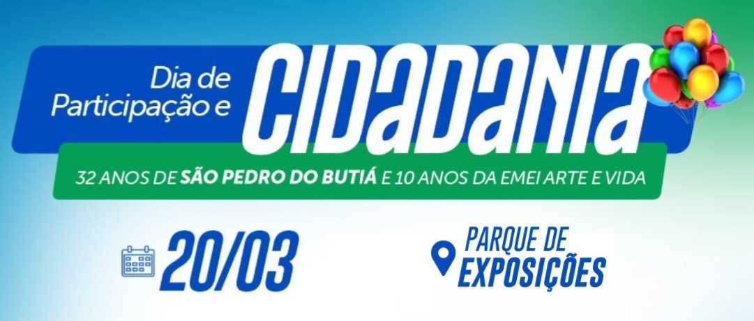 Convidamos você munícipe butiaense para participar do Dia de Participação e Cidadania, Aniversário de 32 anos de São Pedro do Butiá e 10 anos da EMEI Arte e Vida, nesta quarta-feira, 20 de março, com a seguinte programação: