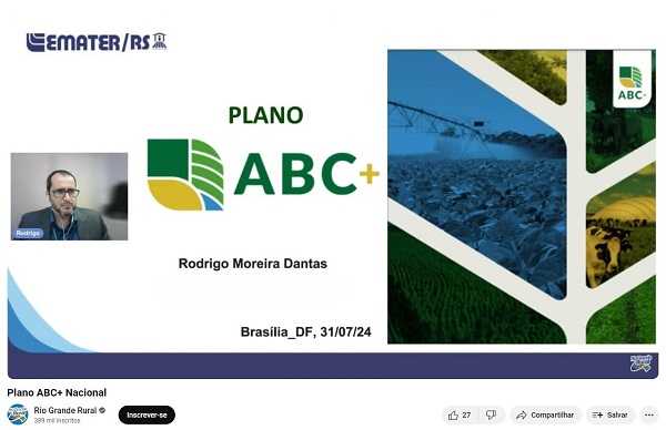 Na abertura do Webinar, o diretor técnico da Emater/RS, Claudinei Baldissera, afirmou que o projeto ABC+ reforça a missão institucional da Emater, com passos calendarizados para a implementação nas unidades, assistência técnica e eventos que o promovam, transversalizando com outras tarefas, a exemplo do Crédito Rural (no Plano Safra 2024/2025, há uma linha do Pronaf voltada ao ABC+). "É um compromisso global, do qual o Rio Grande do Sul é signatário, e a Emater firma o passo com esse compromisso", disse.