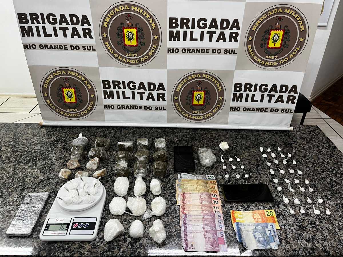 Em busca veicular e pessoal, foram localizados 519 gramas de cocaína, 614 gramas de maconha, 131 gramas de crack, uma balança de precisão, três celulares e dinheiro.