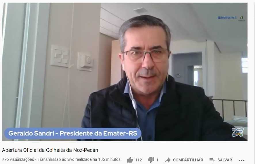 Evento online marcou a terceira edição da Abertura Oficial da Colheita da Nóz-Pecã 2020/2021, ontem (29/04). O evento foi transmitido pela página oficial da Emater/RS-Ascar no YouTube e reuniu, aproximadamente, 200 participantes de todo o Estado, entre eles autoridades, representantes da cadeia produtiva, extensionistas e produtores de nozes. A safra 2021 deverá alcançar a marca recorde de 4.500 toneladas, número superior à marca histórica alcançada em 2019, quando foram colhidas quatro mil toneladas da fruta.