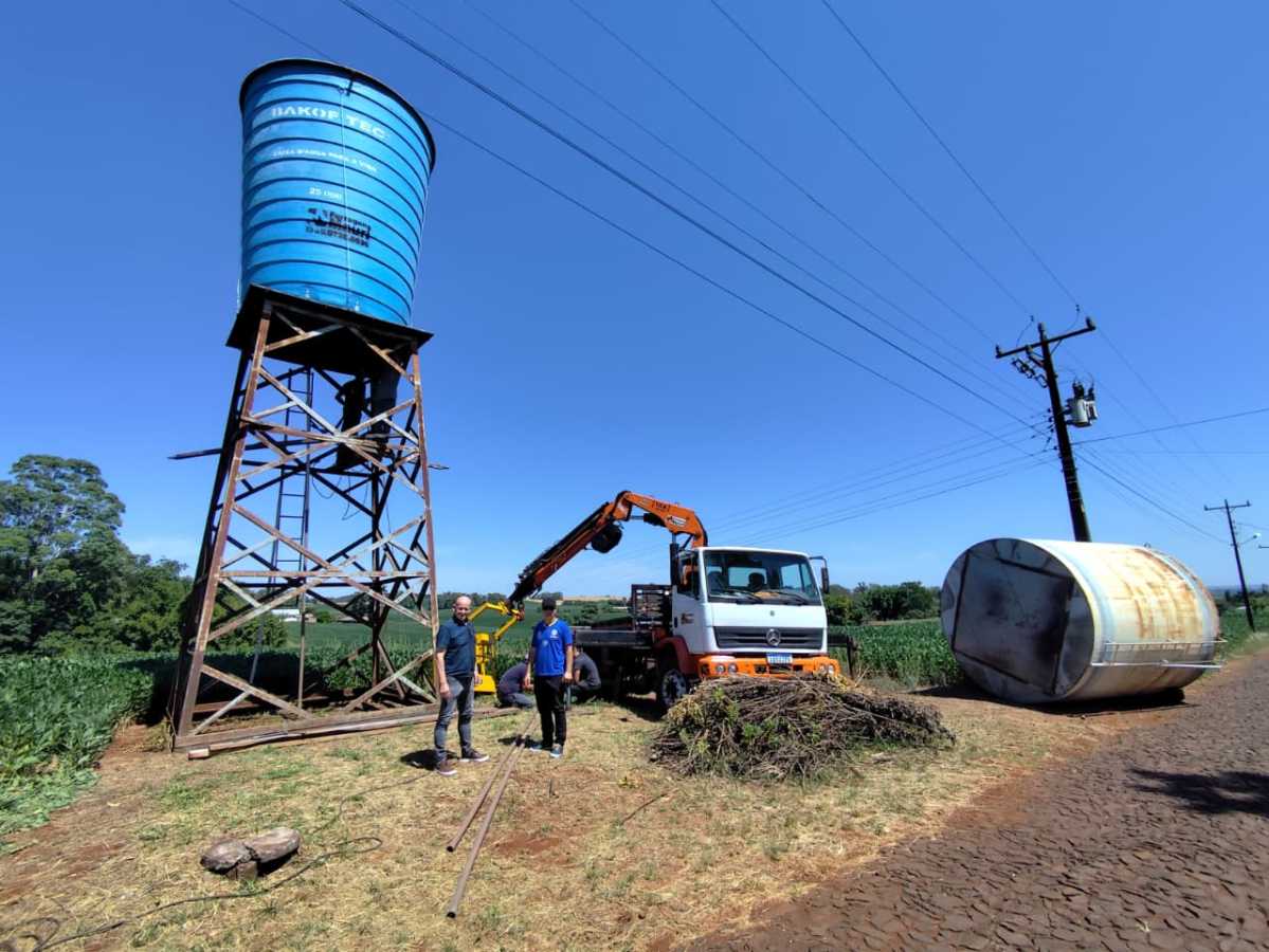 O prefeito em exercício Ambrósio Ten Caten, acompanhado do agente fiscalizador Carlinhos Semprebon, esteve na Vila Santo Antônio acompanhando a troca da caixa d’água da comunidade.