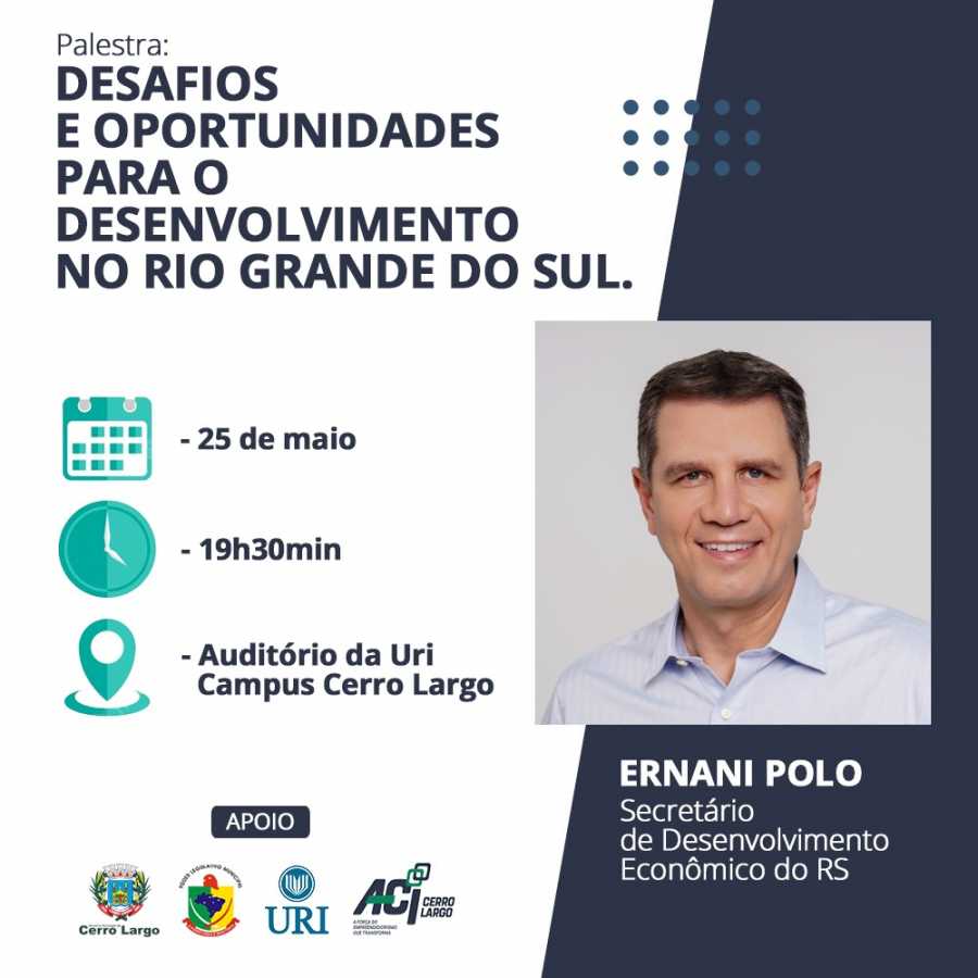 O secretário estadual de Desenvolvimento Econômico do Estado do Rio Grande do Sul, Ernani Polo, é o convidado de evento que acontece na próxima quinta-feira (25/5), no auditório da URI-Cerro Largo, com início às 19h30min.