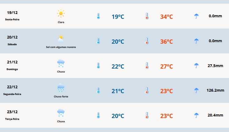 Em Cerro Largo a temperatura mínima será de 19°C e a máxima de 34°C. Em Porto Alegre, varia entre 17ºC e 34ºC, enquanto em Vacaria fica entre 13ºC e 30ºC. Já em Santa Cruz as marcas oscilam entre 17ºC e 36ºC e em Rio Grande entre 19ºC e 31ºC.