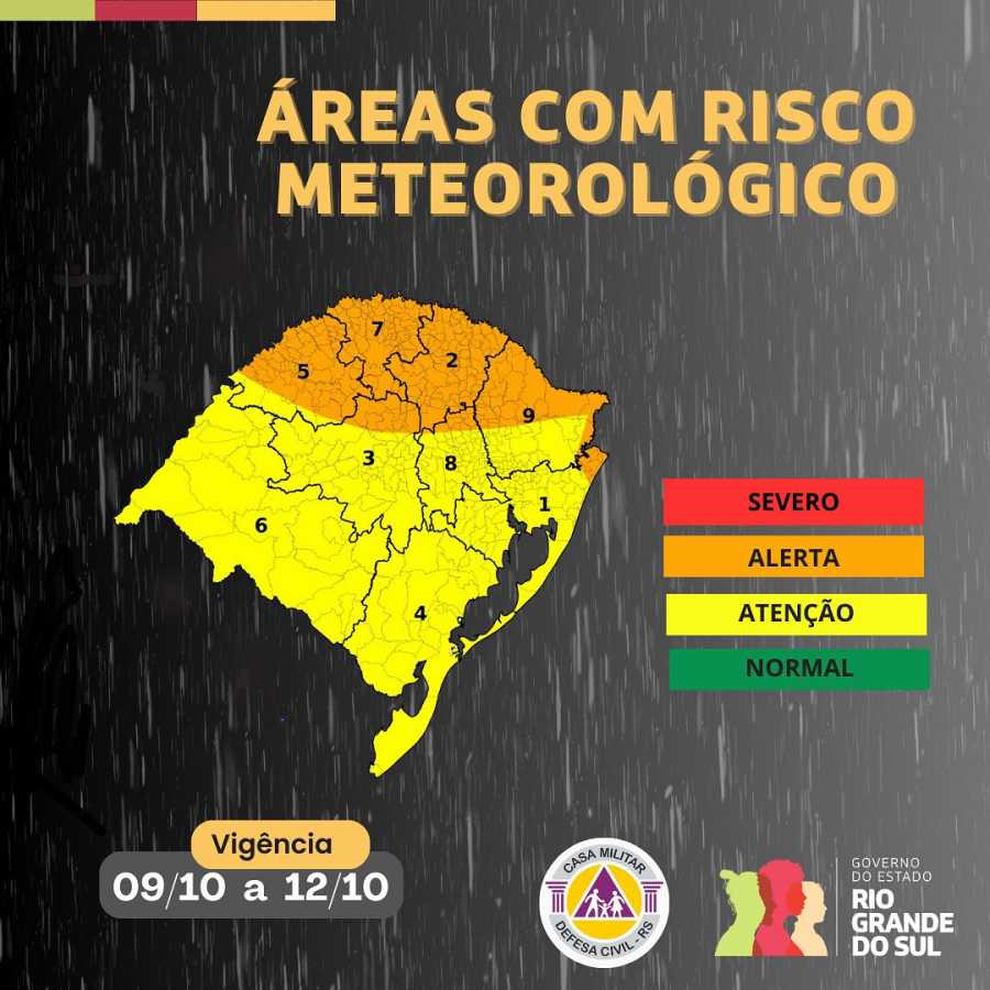 Na quarta-feira (09/10), instabilidades com chuvas moderadas a fortes, descargas elétricas e ventos intensos (50 a 70 km/h, podendo ultrapassar 80 km/h) afetam o Noroeste, Norte, Nordeste e Litoral Norte, com acumulados de 60 a 100 mm/dia. Há risco de movimentos de massa devido à saturação do solo.