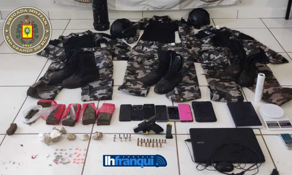 Na residência e nos arredores foram localizadas três fardas camufladas, com capacetes e coturnos, mais de dois quilos de maconha, 160 gramas de cocaína, 82 gramas de crack, 48 comprimidos de ecstasy, balanças de precisão, agendas de anotações, um notebook e celulares.