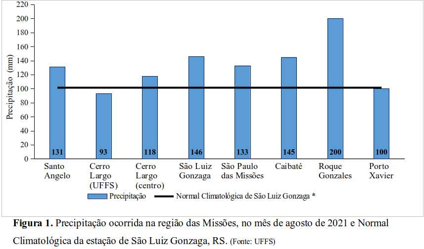 Em Roque Gonzales, estação que mais registrou chuva, o acumulado chegou a 200 mm, praticamente o dobro do esperado para o mês (102 mm). Já em Cerro Largo, no Campus da UFFS, foram registrados 93 mm de chuva em todo o mês de agosto, valor que corresponde a 91% da média do mês. Assim, houve um abrandamento da condição de estiagem na região, que vem prejudicando seriamente a agricultura regional. É necessário acompanhar o quadro para se ter um diagnóstico mais preciso, nos próximos meses. Também é importante chamar a atenção para o prognóstico de chuvas próximas ao normal (250 mm) no mês de outubro, que poderá ocasionar problemas na colheita do trigo.