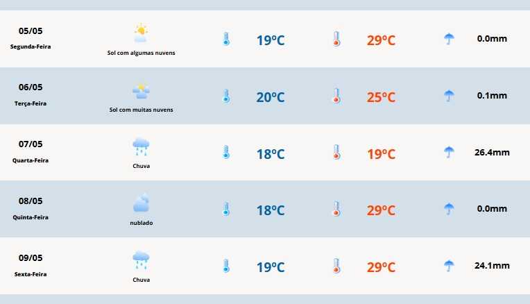 O amanhecer é ameno na maior parte dos municípios, mas na Serra e Aparados faz frio cedo. Já a tarde torna a ser quente para esta época do ano com máximas 5ºC ou mais acima da média máxima de maio em diversas localidades, inclusive na Grande Porto Alegre.