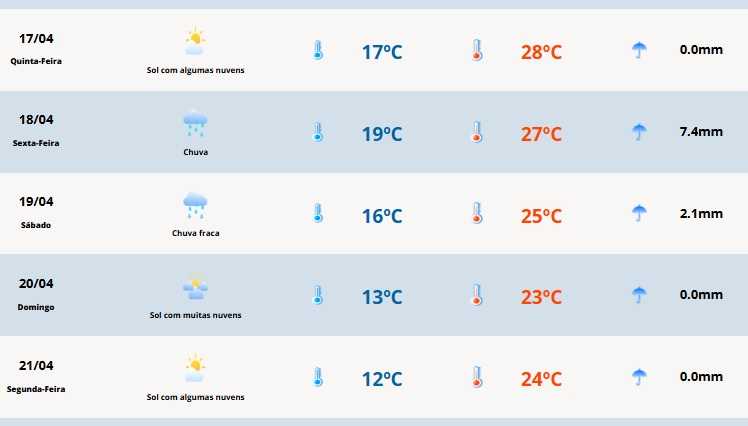Em Cerro Largo a temperatura terá mínima de 17ºC e máxima de 28ºC.