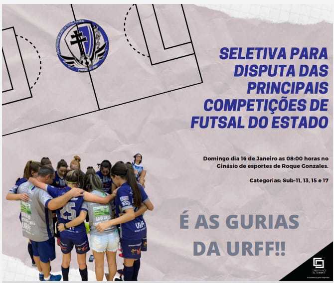 A União Roque-gonzalense de Futsal Feminino (URFF) estará realizando uma seletiva para meninas de 9 a 17 anos. Será no dia 16 de janeiro, às 8h, no Ginásio de Esportes de Roque Gonzales.