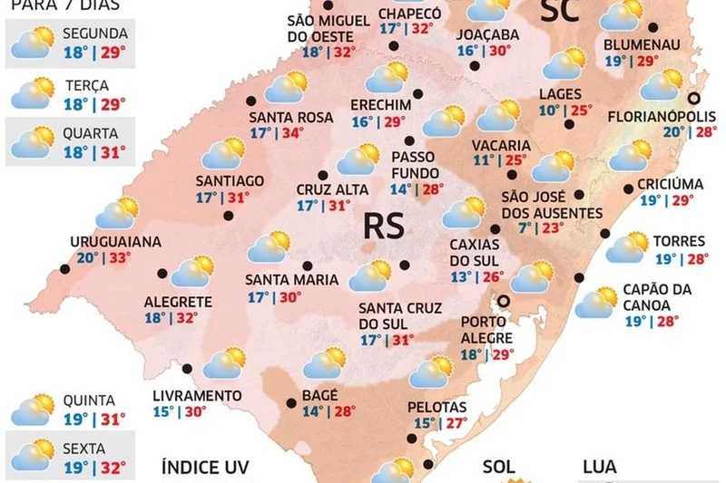 A chuva será muito escassa, o que por um lado é uma boa notícia para quem está nas praias e por outro é muito ruim no campo que depende de chuva para as culturas da safra de verão. O tempo aberto proporciona uma madrugada amena e até com frio em cidades da Serra, mas à tarde tem calor que é maior em cidades da Fronteira Oeste e do Noroeste.