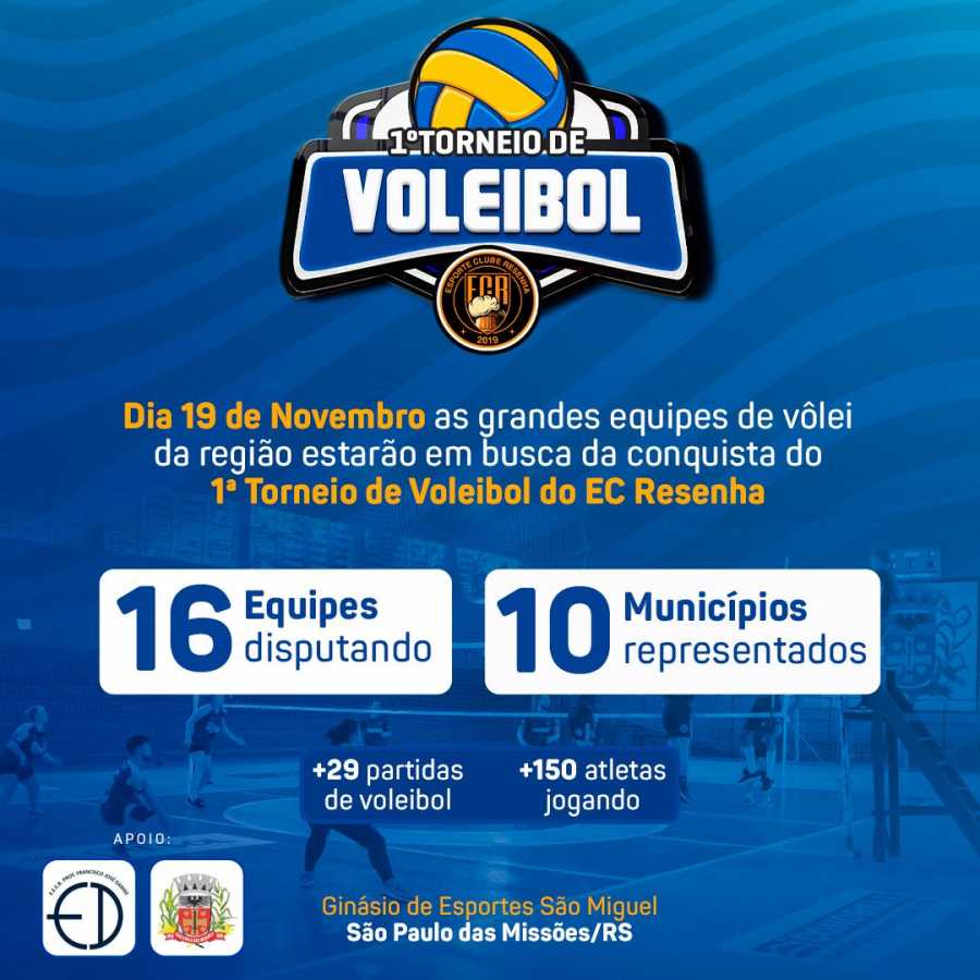 No próximo domingo, dia 19 de novembro de 2023, a partir das 8h, no Ginásio Estadual de Esportes São Miguel, em São Paulo das Missões, acontecerá o 1º Torneio Regional de Voleibol Misto, desenvolvido pela equipe do Esporte Clube Resenha.