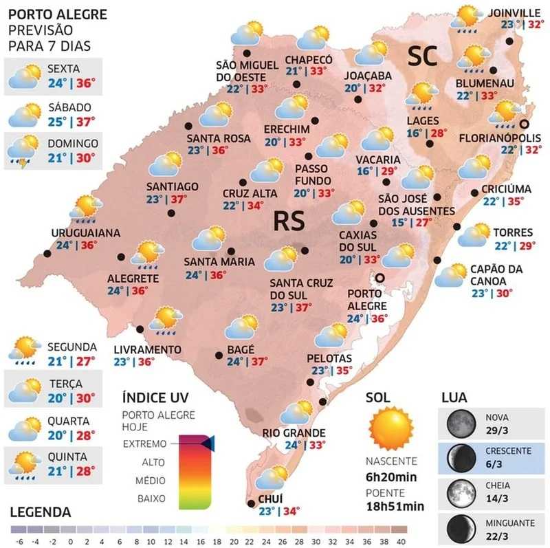A massa de ar muito quente persiste sobre o estado no que será o penúltimo dia da onda de calor que se iniciou ainda em fevereiro. Com isso, os gaúchos vão enfrentar mais uma jornada com forte a intenso calor em que as temperaturas máximas da tarde devem ser parecidas com as observadas ontem no Rio Grande do Sul.
